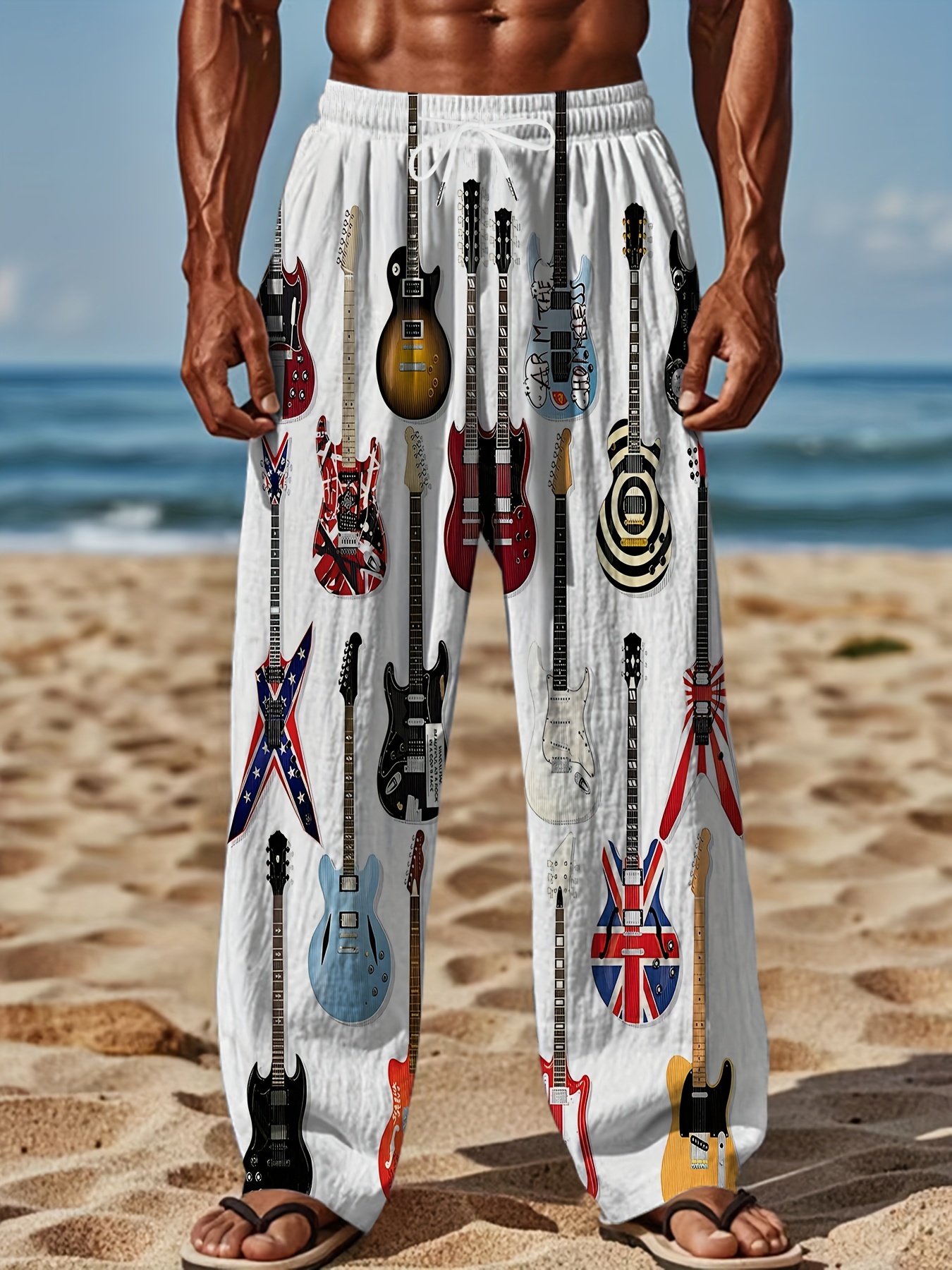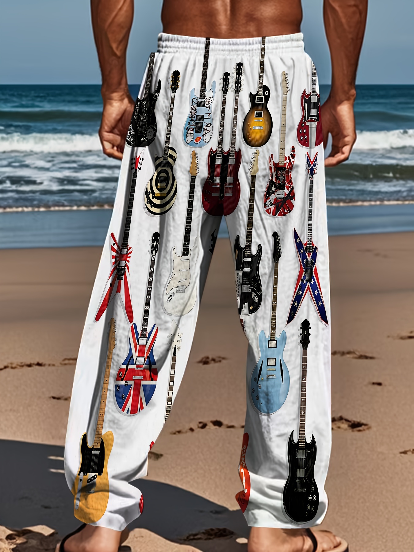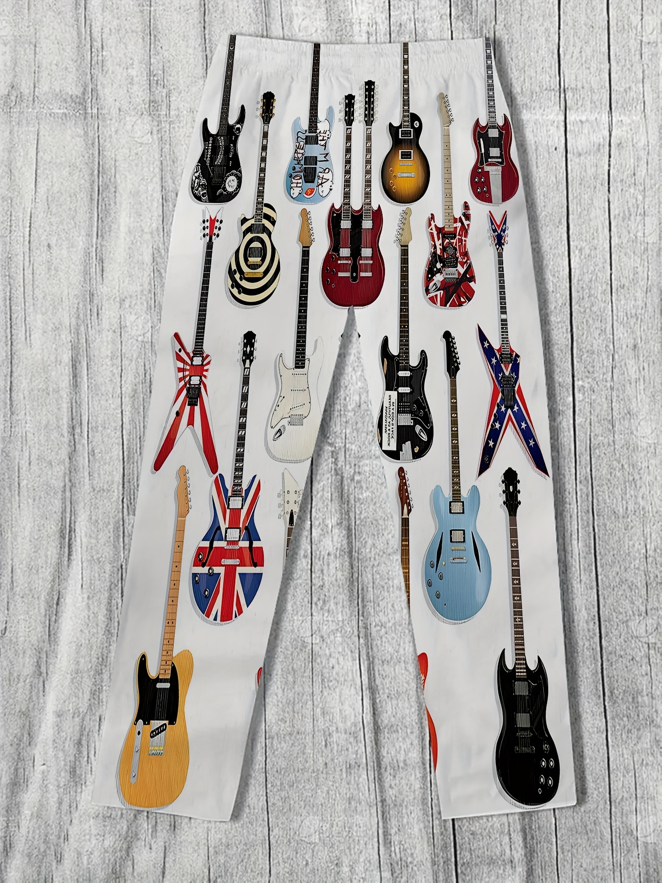 Men's Vintage-Inspired Guitar Print Casual Pants - Loose Fit, Drawstring Waist, Polyester, Machine Washable
