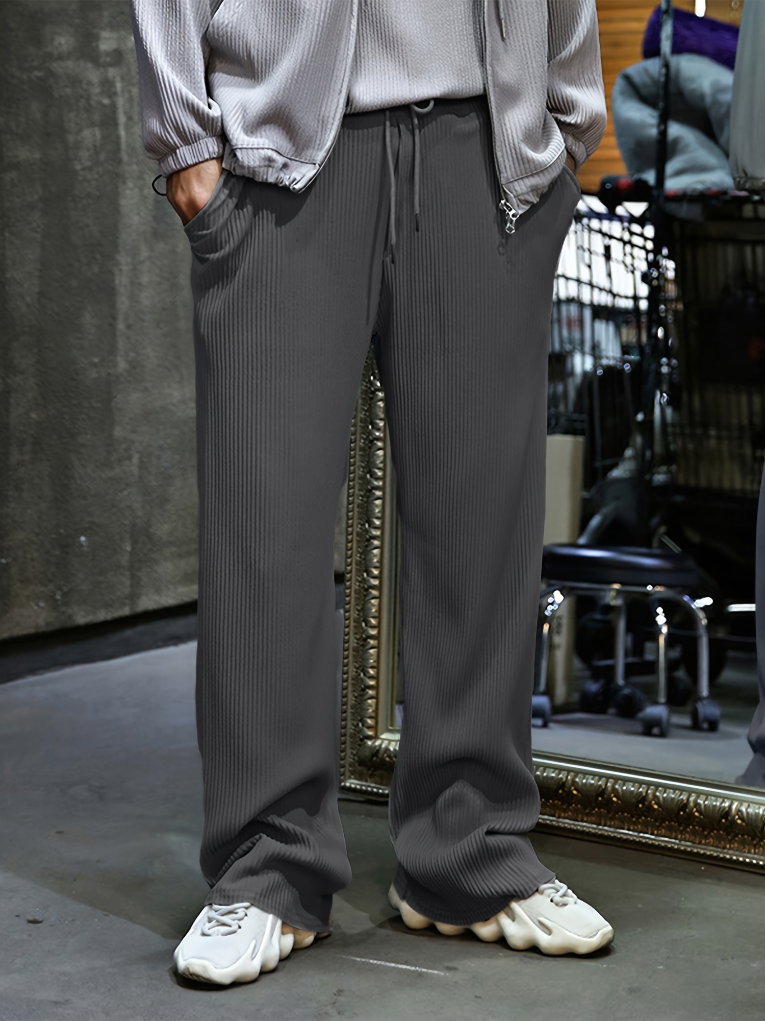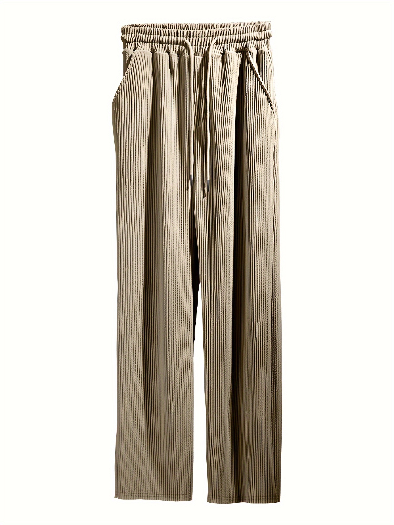 Men's Drawstring Pants Mid Waist Straight Leg Long Pants Casual Solid Color Ribbed Pants