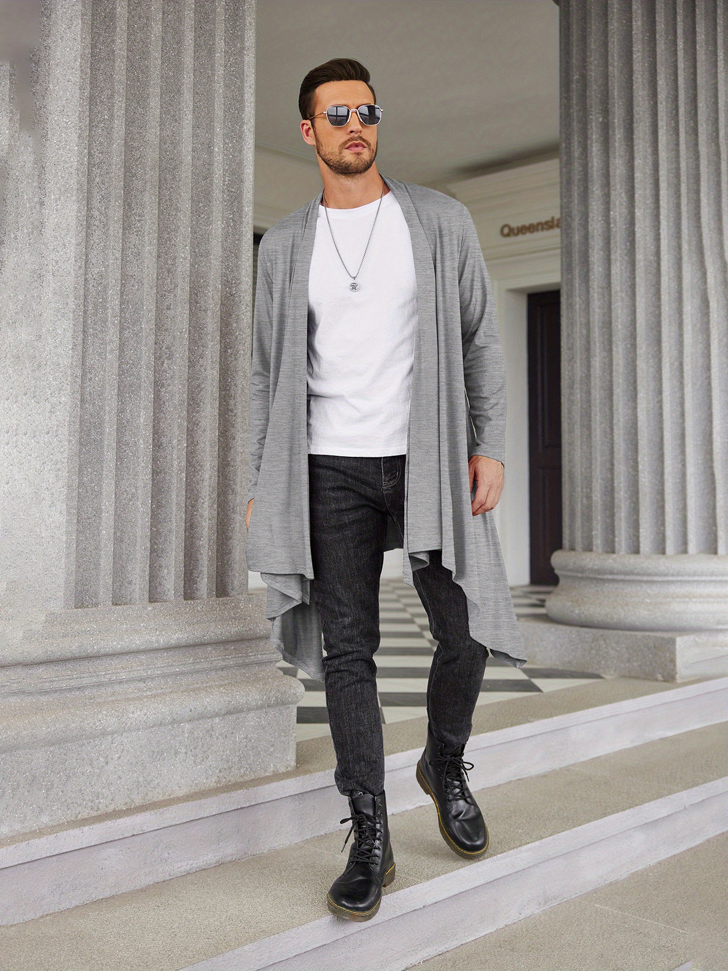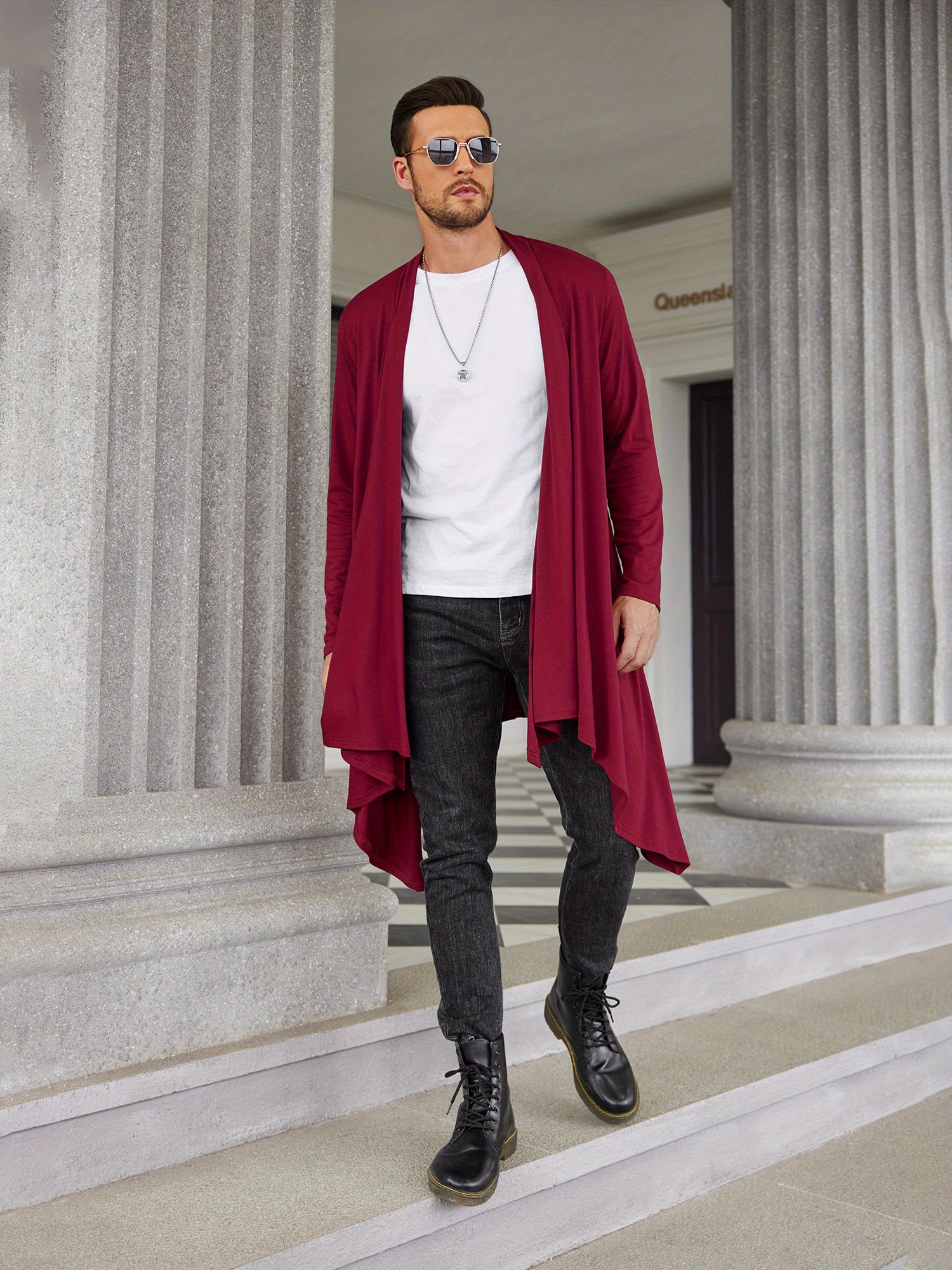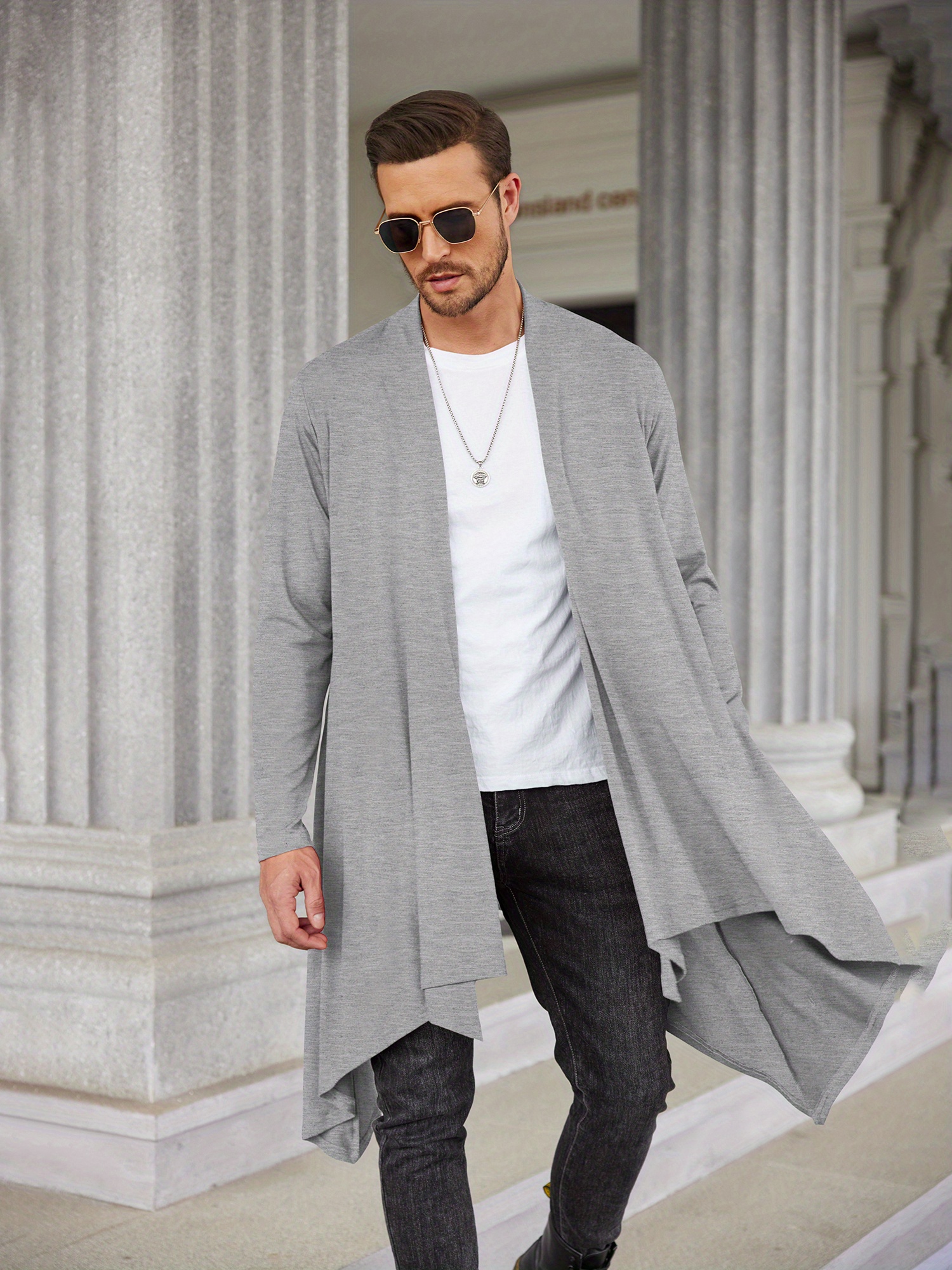 Men's Ruffle Shawl Collar Cardigan Long Sleeve Open Front Lightweight Long Length Drape Cape Overcoat with Pockets
