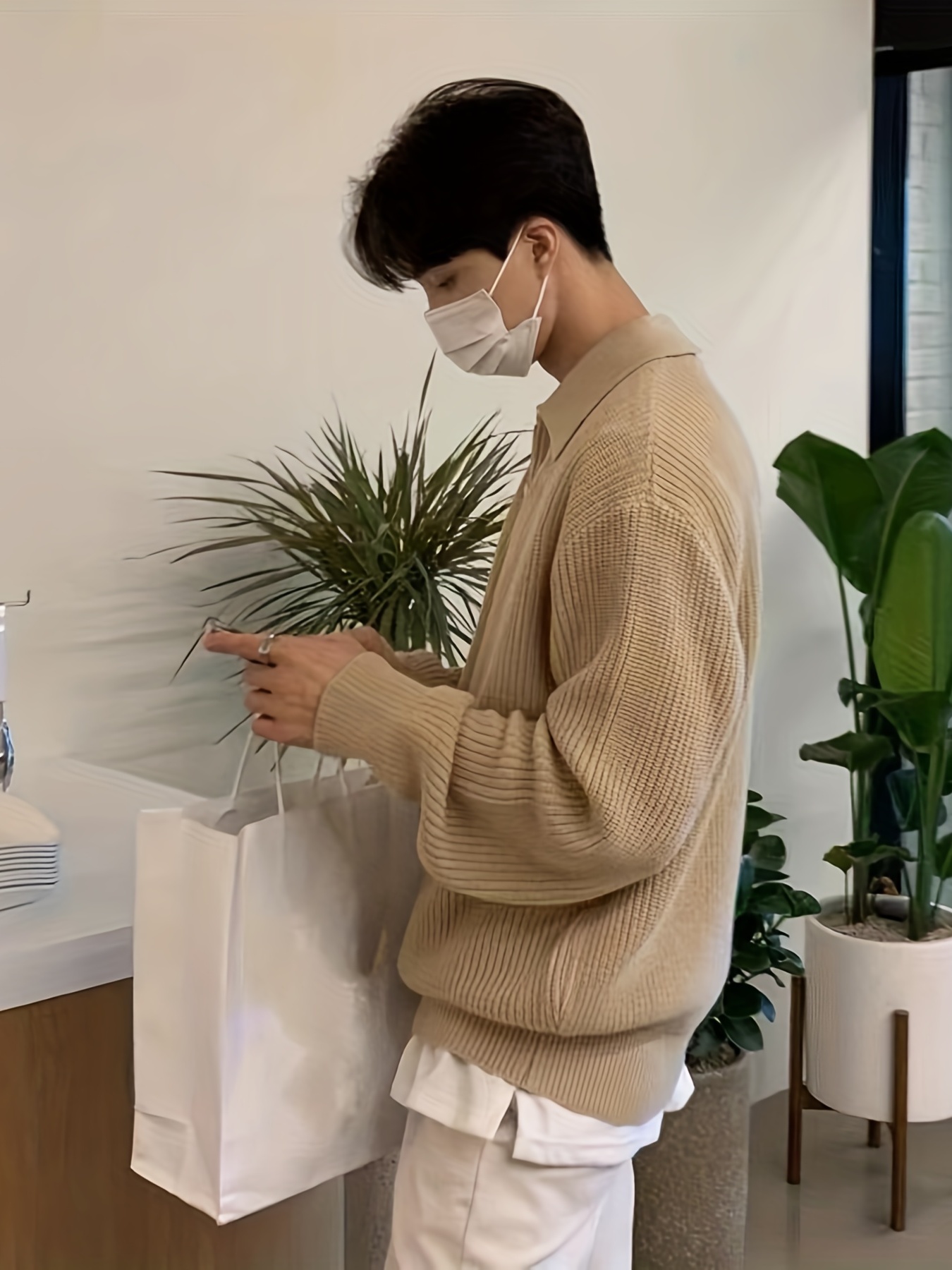 Men's Stylish Solid Knitted Shirt, Casual Slightly Stretch Breathable Lapel Zip Up Long Sleeve Shirt Top For City Walk Street Hanging K-pop