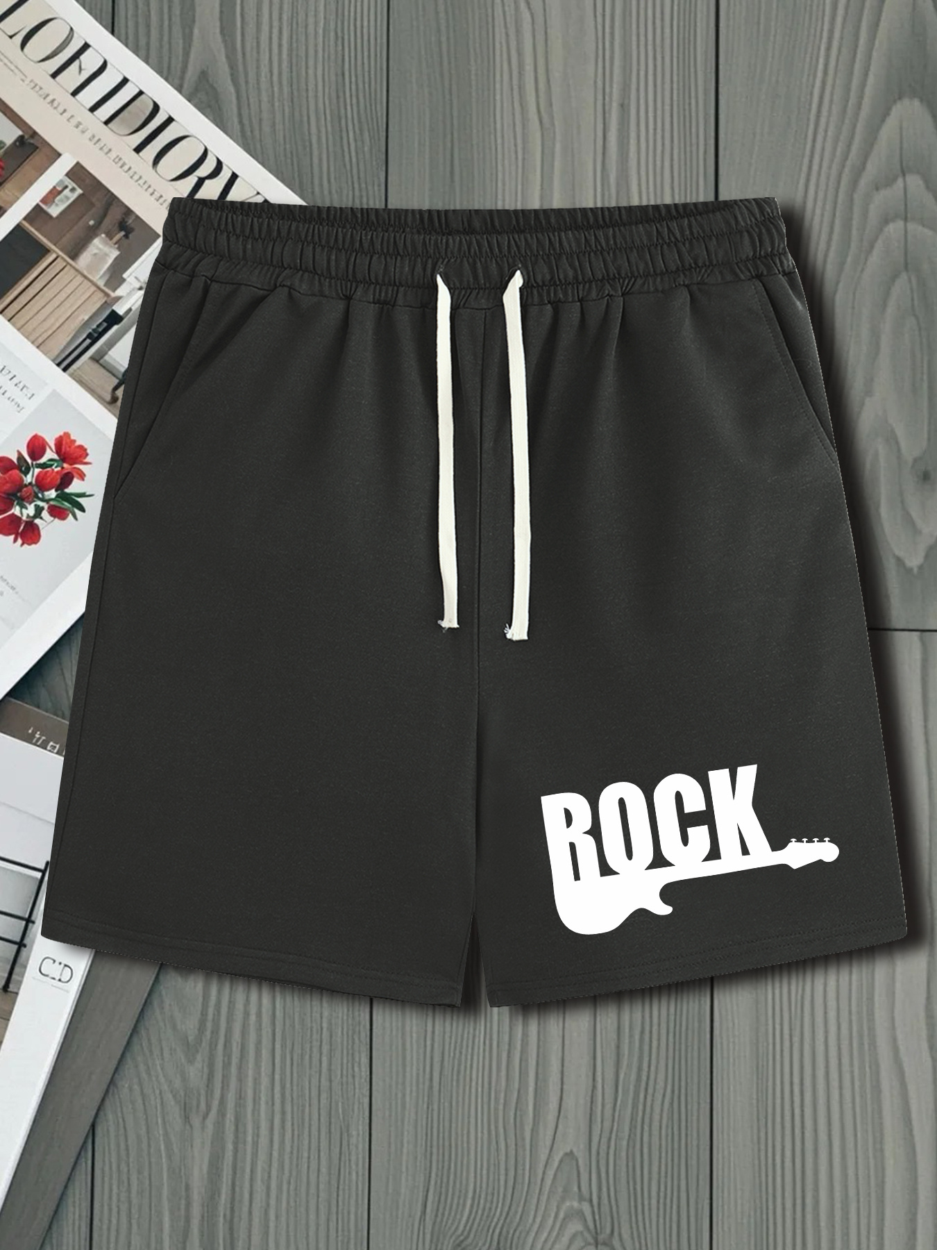 Men's Casual Rock Print Drawstring Shorts - Breathable Polyester, Pockets Included, Machine Washable