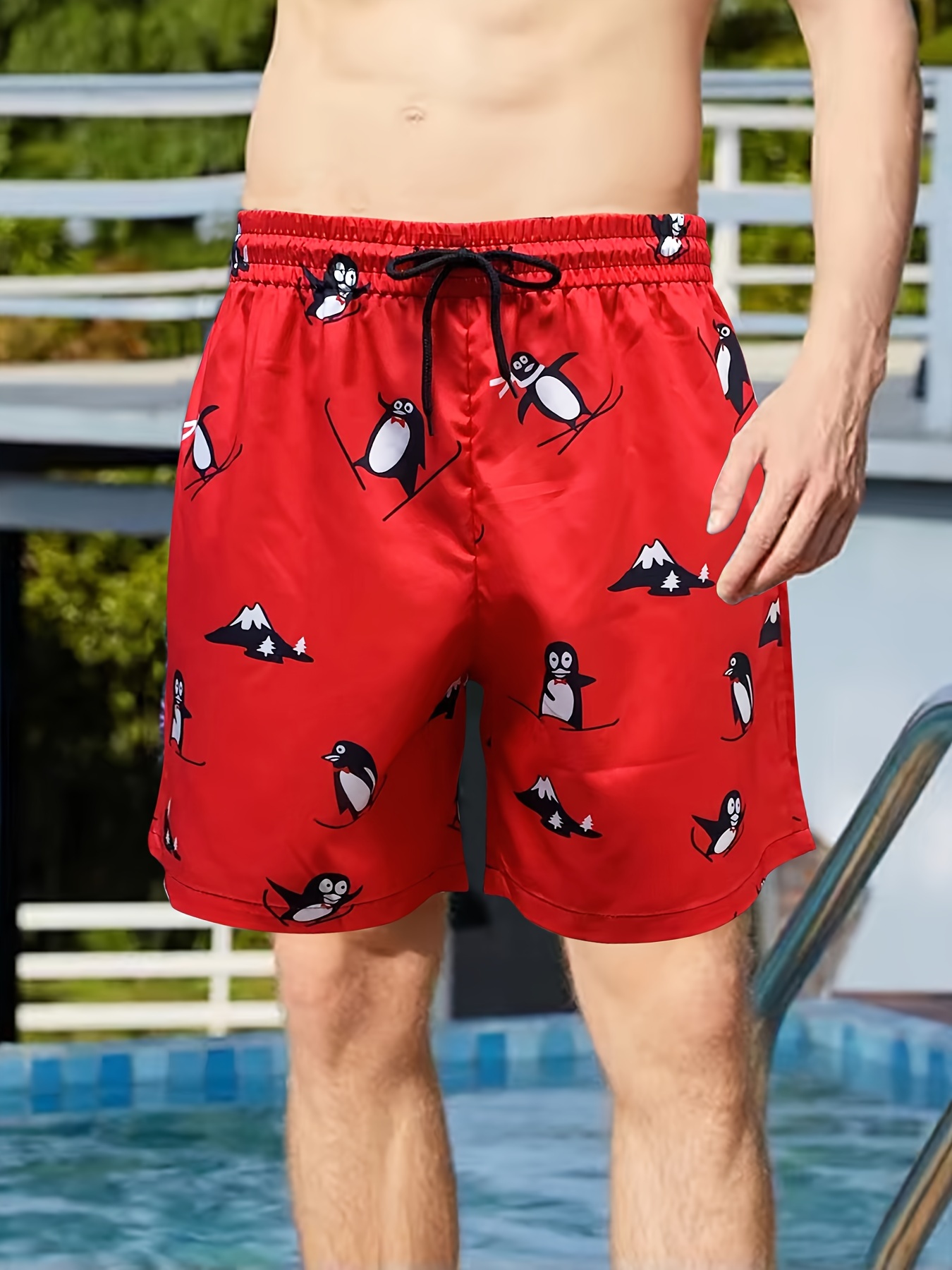 Men's Trendy Cartoon Penguin Pattern Print Active Shorts, Drawstring Beach Shorts For Summer Beach Resort, Hawaiian Shorts